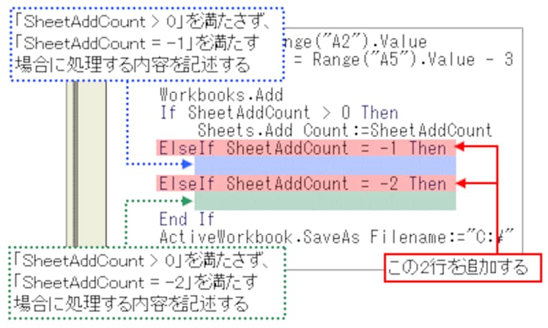 したがって、先ほどのIfステートメントに「ElseIf」を追加して、追加するワークシートの数が「-1」と「-2」の場合だけ、ワークシートを削除する処理を実行するようにします。条件が2つあるので、2つの「ElseIf」を記述します。