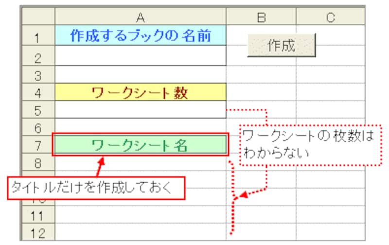 前回までの作業で、指定した枚数のワークシートが作成されるところまで作成しました。今回は、作成されたワークシートのシート名(シート見出しに表示する文字列)も設定できるようにします。![]() |
