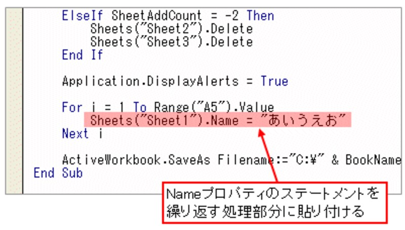 現在作成しているプロシージャに切り替えて、このステートメントを、繰り返し実行させたい「シート名を設定する処理」のところにコピーしておきます。この部分を、繰り返し処理のためにどう書き換えるのか。これが今回の大きなポイントです。