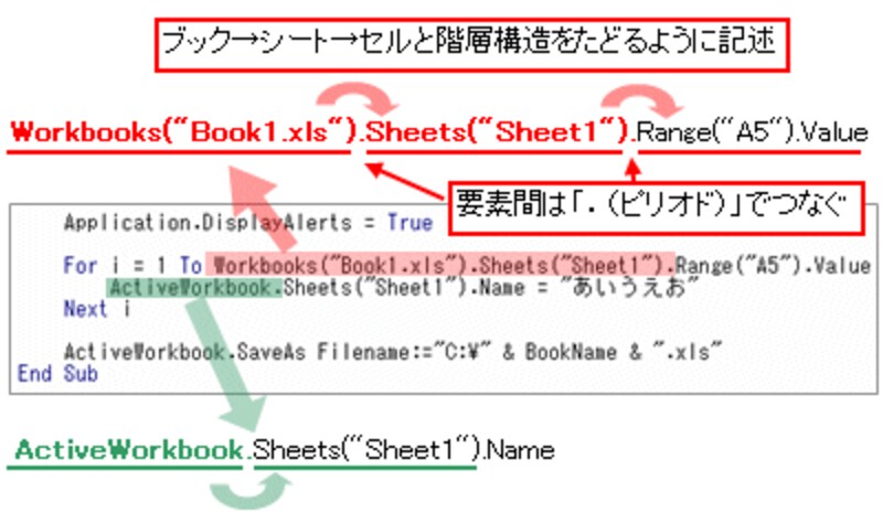 そして、プロシージャ内で操作する要素に対して、それぞれ「どちらのブックの要素なのか」を記述します。このとき、シートについては「ブック.シート」、セルについては「ブック.シート.セル」といったように階層をたどって記述する必要があります。アクティブなブックは「ActiveBook」、アクティブではないブックは、「Workbooks("ブック名")」と記述できるので、今回の場合は、下図のように追記します。