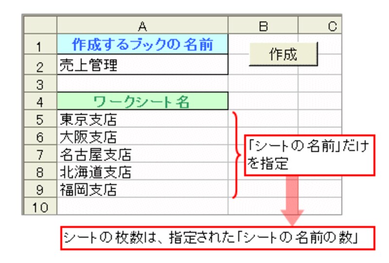 現状では、シートの枚数とシートの名前を別々に設定しています。これでは「指定したシートの枚数」と「指定したシートの名前の数」が合わない場合があるかもしれません。これらの数が合わないとエラーが発生する可能性があります。そこで、シートの枚数を指定しないで「シートの名前」だけを指定する形に修正します。シートの枚数は、指定された「シートの名前の数」となります。![]() |