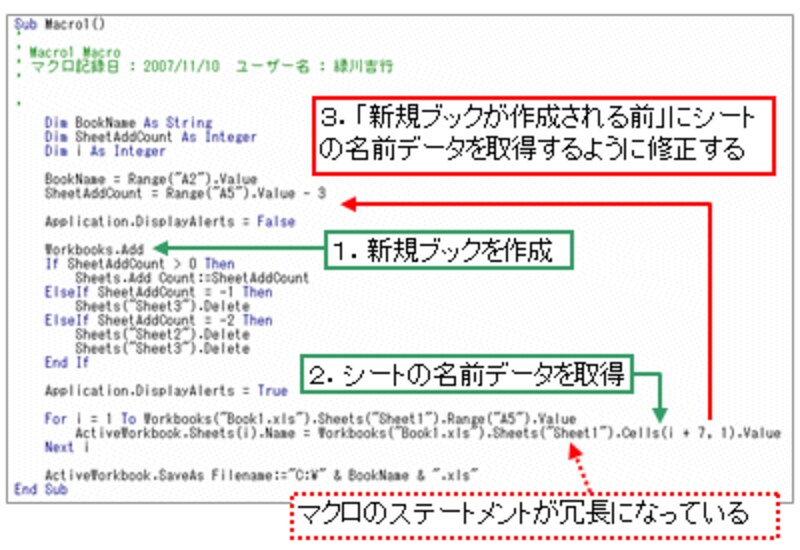 | ※ここでは、「作成するブック名を取得するタイミングとシートの名前データを取得するタイミングを合わせること」、「オブジェクトを参照する回数をできるだけ減らすこと」を考えて、上記のような改善を考えています。 |