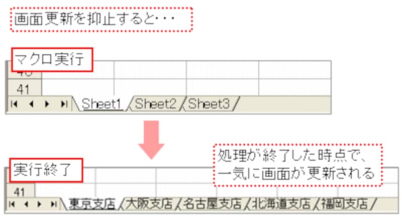 現状では、マクロが実行されている間、ブックが作成されたり、ワークシートが作成されたりすると、その処理に合わせて画面表示が更新されるため、画面がちらつきます。これでは、追加するワークシートが多い場合などで、処理速度が遅くなってしまいます。