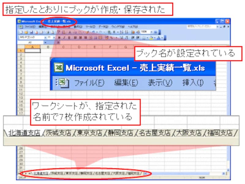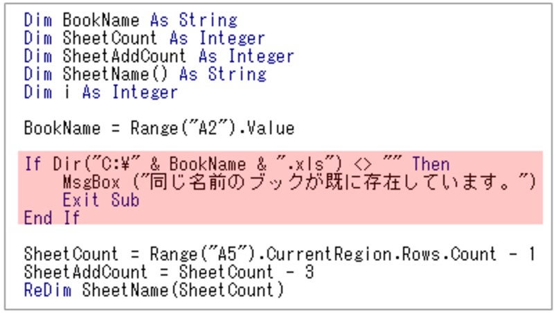 ※ひとつの改善方法として、設定するブック名を取得した直後に、保存先に同名のブックがあるかどうかをチェックし、ある場合はプロシージャの実行を強制的に終了する方法があります。保存先にブックがあるかどうかを調べるには「Dir関数」を使用し、プロシージャの実行を強制的に終了するには「Exit Subステートメント」を使用します。参考までに、そのプログラミング例を掲載します。