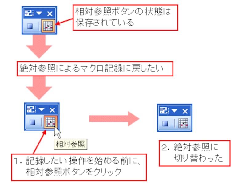 なお、「記録終了」ツールバーの相対参照ボタンの状態は保存されます。したがって、通常の絶対参照によるマクロ記録に戻す場合は、記録したい操作を始める前に、相対参照ボタンをクリックする必要があります。