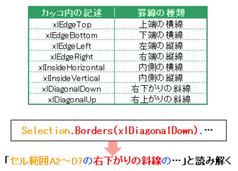 | ※厳密に言うと、「Borders」の後に続くカッコは、BordersコレクションのItemプロパティ(罫線の設定箇所を指定するプロパティ)の引数部分ですが、Itemプロパティが省略されているために、「Borders (xlDiagonalDown)」という記述になっています。省略せずに記述すると、「Borders.Item (xlDiagonalDown)」となります。しかし、マクロ記録では、Itemプロパティが省略されて記述されるため、「Borders(罫線の設定箇所)」が罫線を表すBorderオブジェクトを表している、と解説しています。 |