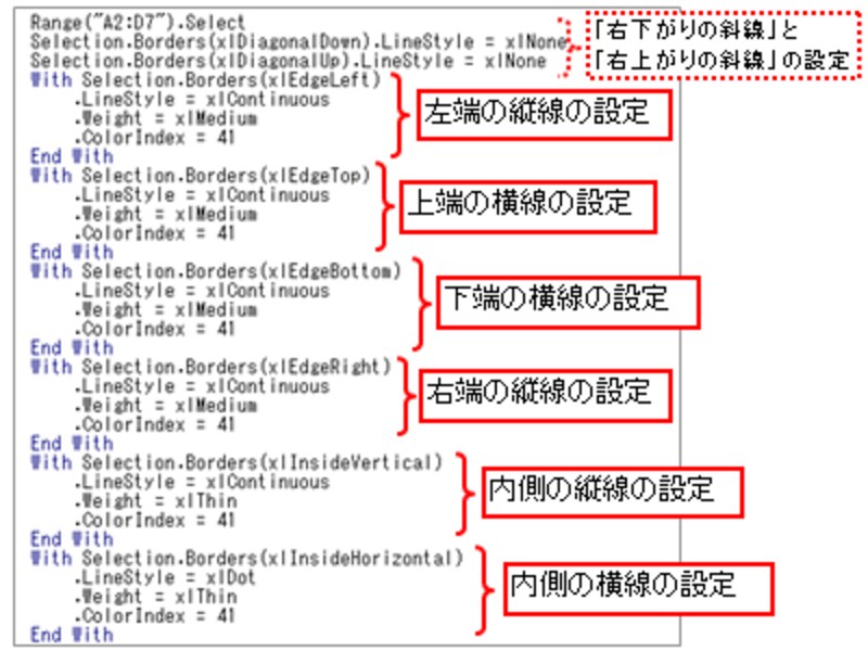 したがって、3行目以降の各Withステートメントの記述が、各箇所の罫線の設定であることが読み解けます。