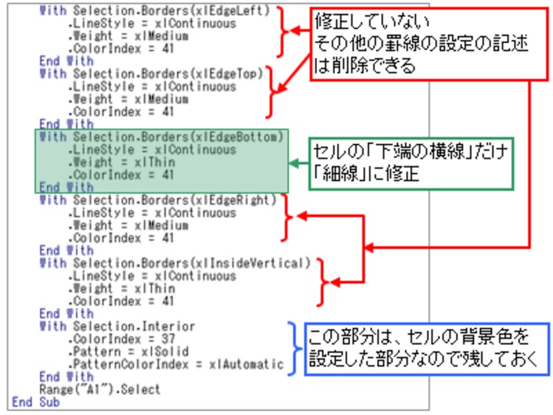 セル範囲A2~D2については、セルの下側の罫線だけ、標準の罫線に修正しました。ところが、マクロ記録では、修正していないその他の罫線の設定についても記述されています。これらのステートメントも、すでに設定されている内容なので削除できますね。![]() |