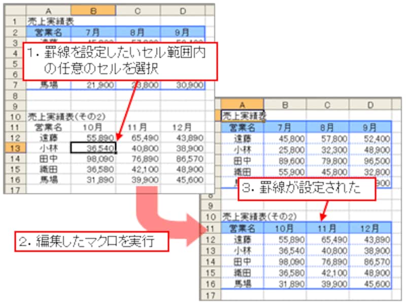 今度は、事前にセル範囲を選択する操作も不要なマクロに編集してみましょう。罫線を引きたいセル範囲内の任意のセルを選択しておき、そのセルを含むアクティブセル領域を利用して、罫線を引くセル範囲を自動認識させるのがポイントです。アクティブセル領域を参照するには、RangeオブジェクトのCurrentRegionプロパティを使用します。Selectionプロパティは、現在選択されているセルを参照するので、選択されているセルを含むアクティブセル領域、つまり罫線を引きたいセル範囲が参照できる、というわけです。