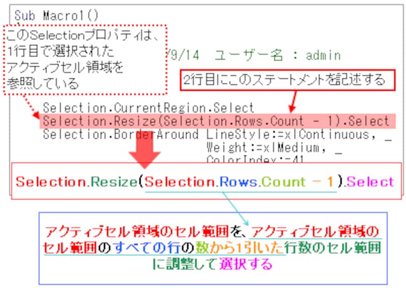選択領域を小さくしたセル範囲を選択するにはResizeプロパティを使用します。引数RowSizeに、調整後のセル範囲のサイズを指定します。今回は1行分だけ小さいサイズにしたいので、「選択されているセル範囲の行数」から1引いたサイズを指定します。