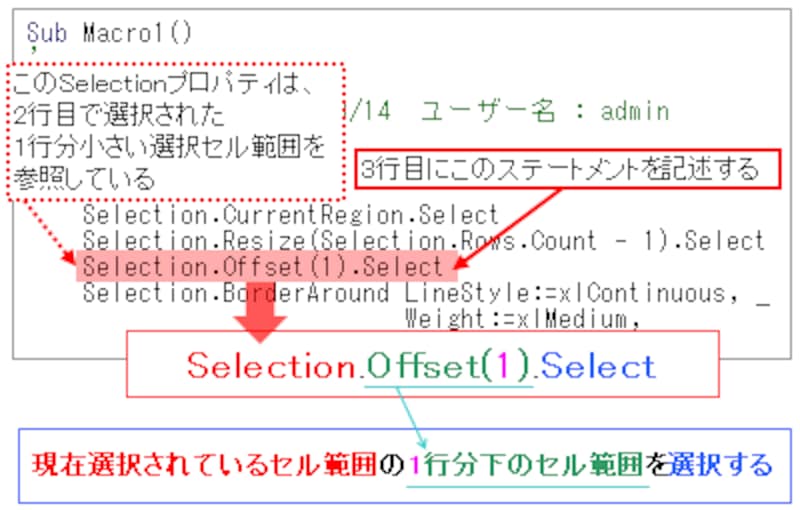 選択範囲を1行分下に移動するにはOffsetプロパティを使用します。1行分だけ下に移動したいので、引数RowOffsetに「1」を指定します。