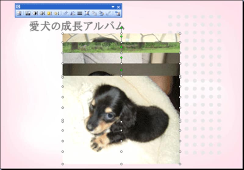 写真の横方向の位置が揃いました。「パワポでパラパラ写真を作る(写真の順序)」で、写真のサイズを揃えておいたので、写真の左右の位置がぴったり合っているのが確認できます。