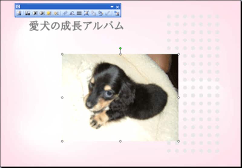 写真が選択されている状態のまま、「図形描画」ツールバーの「図形の調整」→「配置/整列」→「上下中央揃え」をクリックします。
