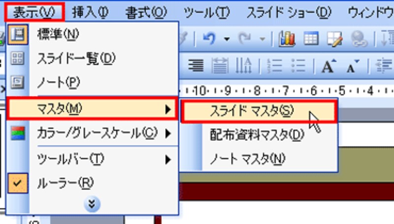 次に、すべてのスライドに会社のロゴが表示されるように、スライドマスタ画面に切り替えます。それには、「表示」メニューから「マスタ」→「スライドマスタ」をクリックします。