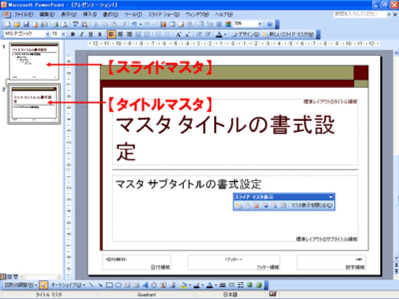スライドマスタ画面で注意すべきことは、左側に「スライドマスタ」と「タイトルマスタ」の2種類が表示されているということ。上段のスライドマスタに設定した内容は、「タイトルスライド」という名前のレイアウト以外のスライドに反映されます。
