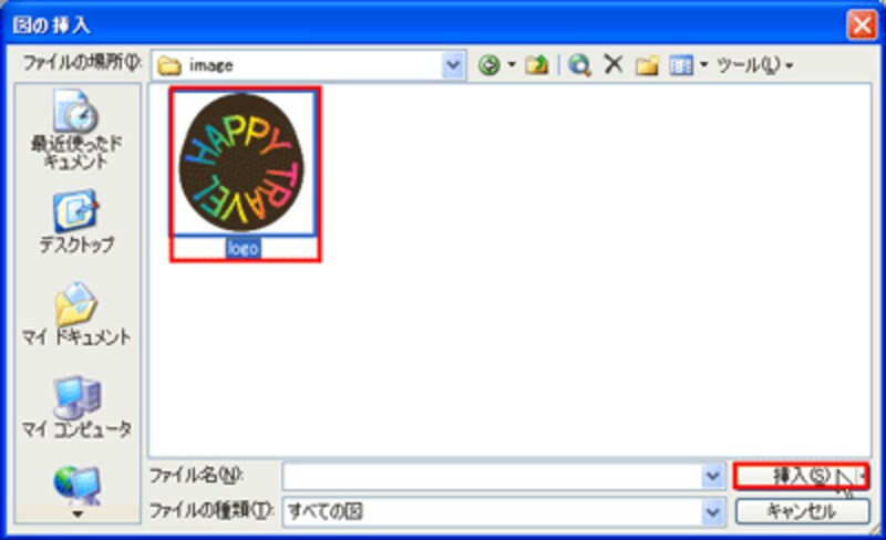「図の挿入」ダイアログボックスが表示されたら、会社のロゴの画像を選択し、「挿入」ボタンをクリックします。