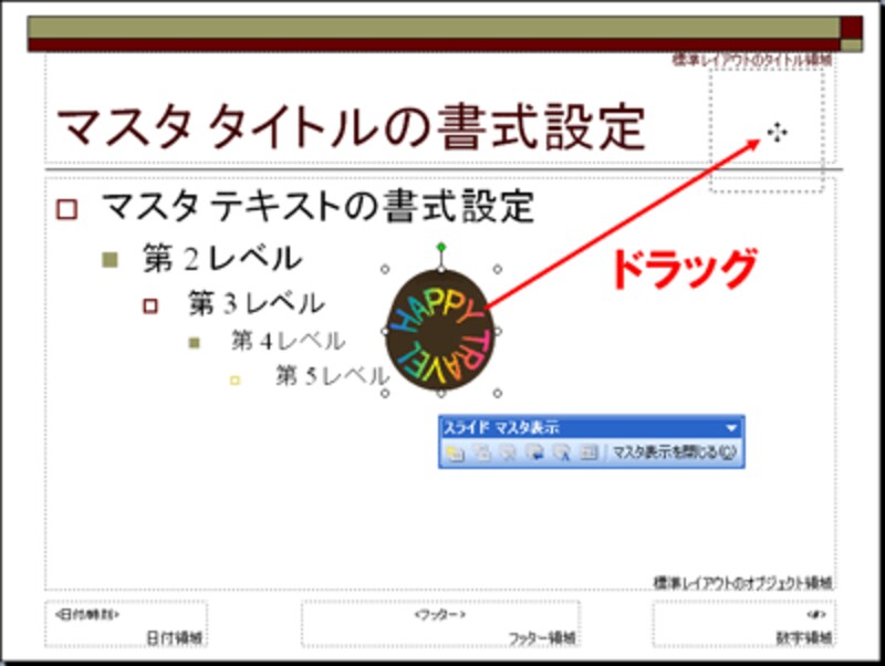 スライドマスタに会社のロゴが表示されるので、ロゴを直接ドラッグして場所を移動したり、周りの白いハンドルをドラッグしてサイズを調整します。
