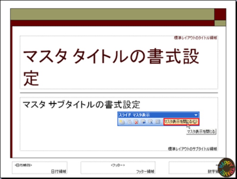 | PowerPoint2007では、「スライドマスタ」タブの「マスタ表示を閉じる」ボタンをクリックする |