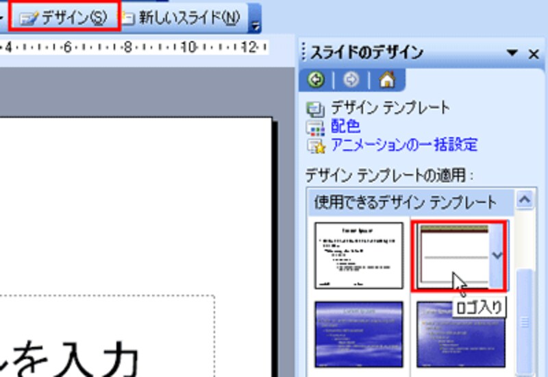右側に表示された「スライドのデザイン」作業ウィンドウの「使用できるデザインテンプレート」の中に、先ほど登録したロゴ入りデザインが追加されているのが確認できます。これなら、クリックするだけでこのデザインを何度でも利用できて便利です。