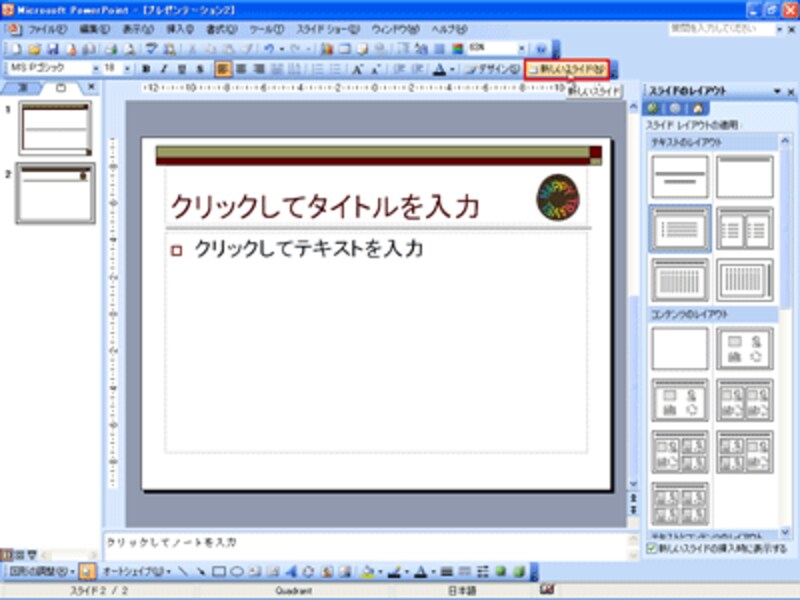 ツールバーの「新しいスライド」ボタンをクリックすると、2枚目のスライドが追加され、このスライドにも会社のロゴが表示されます。