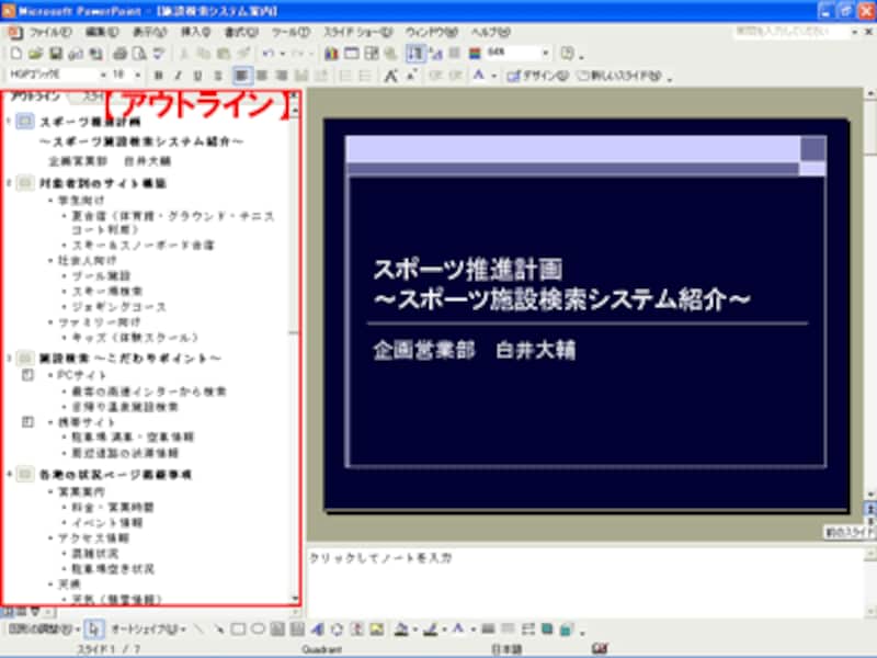 準備段階で活躍するのが、PowerPointの「アウトライン機能」。ワープロ感覚で情報を入力したり、修正したり、順番を入れ替えながら、資料の骨格を作成できます。