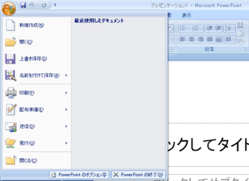 | PowerPoint2007では、「Officeボタン」をクリックすると、ファイル関連のメニューが表示される |