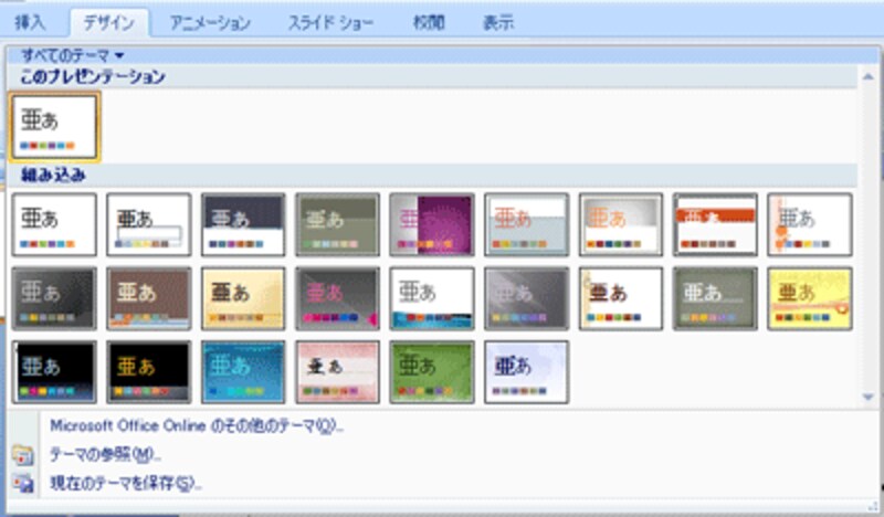 | PowerPoint2007のスライドデザイン。シンプルで使いまわしのきくデザインが中心だ |