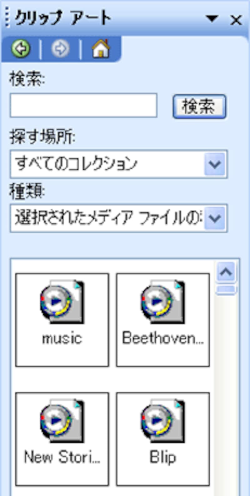 「クリップアート」作業ウィンドウが表示され、サウンドファイルの一覧が表示されました。