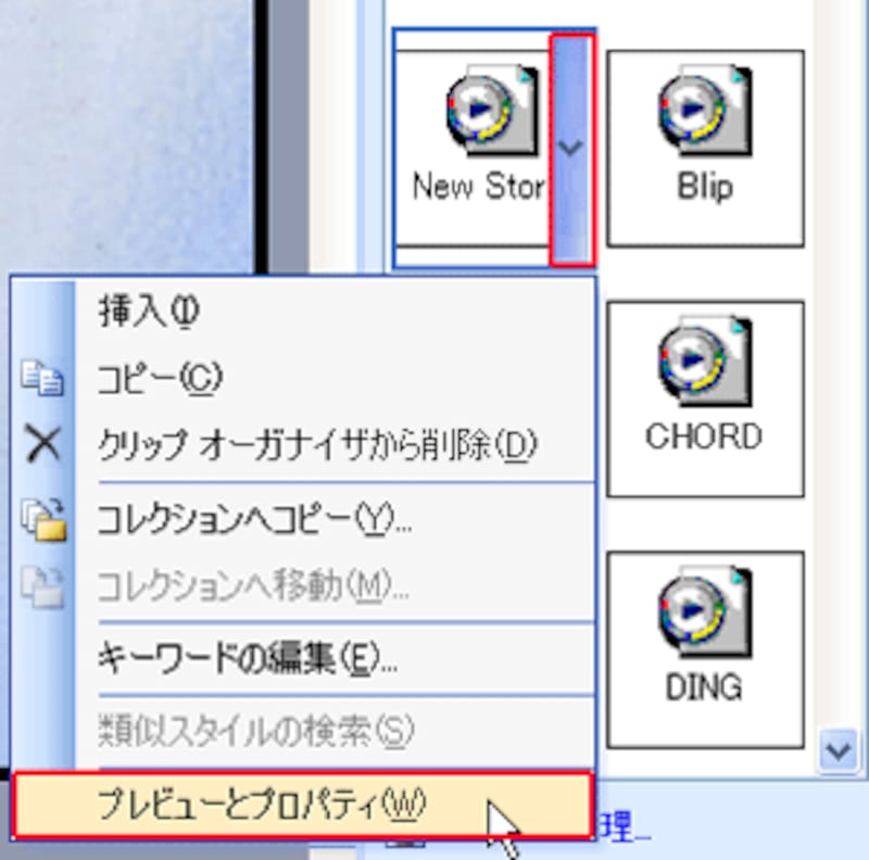 サウンドファイルにはそれぞれ名前が付いていますが、名前を見ただけではどんな音楽なのかはわかりません。このようなときは、スライドに埋め込む前に「視聴」してみるのが一番。サウンドのアイコンの右側に表示される▼ボタンをクリックし、「プレビューとプロパティ」をクリックします。まだ、スライドにサウンドを埋め込む前の確認作業なので、どのサウンドでもかまいません。