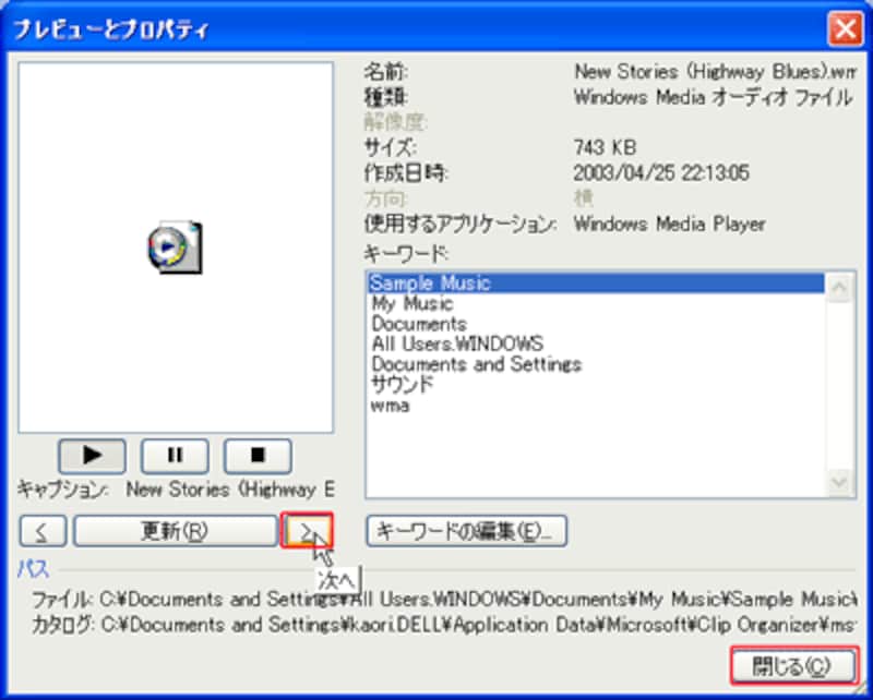 「プレビューとプロパティ」画面が表示されると、自動的に再生が始まります。音が聞こえない場合は、パソコンの音量を確認してください。なお、「次へ」ボタンをクリックすると、「クリップアート」作業ウィンドウに表示されたサウンドを順番に再生することができます。視聴が終ったら「閉じる」ボタンをクリックして「プレビューとプロパティ」画面を閉じておきます。