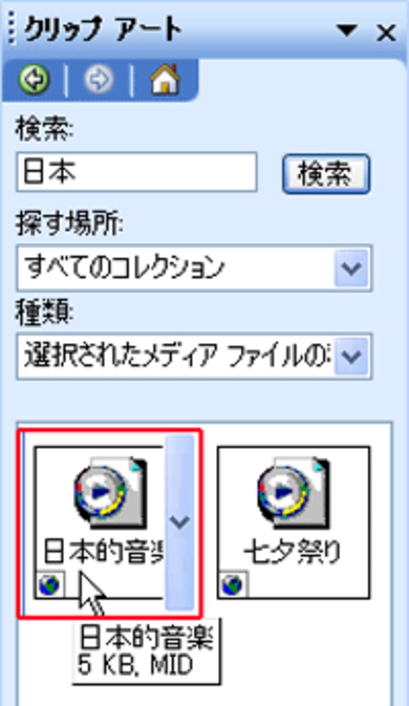1曲ずつすべてのサウンドを視聴してもかまいませんが、キーワードでサウンドファイルを絞り込んだほうが効率的です。ここでは、「検索」ボックスに「日本」と入力して「検索」ボタンをクリックします。![]() |