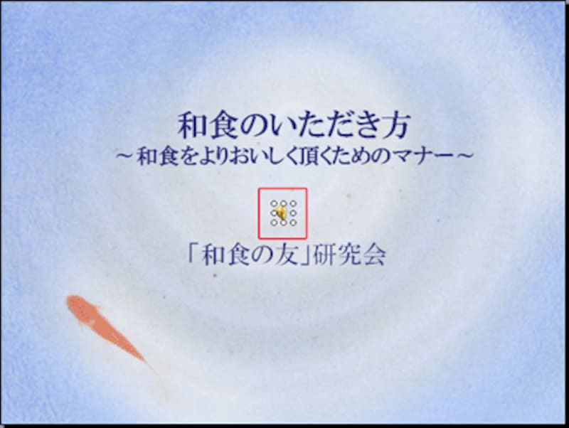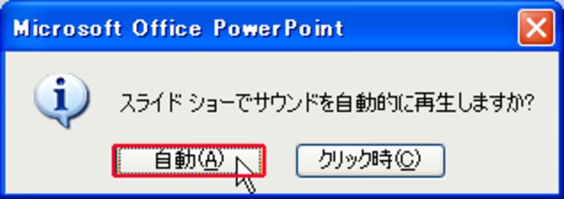 スライドにサウンドファイルを挿入すると、「スライドショーでサウンドを自動的に再生しますか?」というメッセージが表示されます。表紙のスライドが表示された途端に自動的に再生を開始したければ「自動」ボタン、説明に合わせて発表者がクリックしたタイミングで再生を開始したければ「クリック時」ボタンをクリックします。