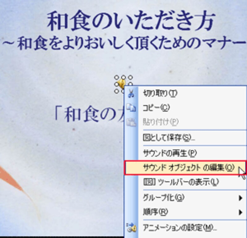 ただし、このままではスライドショー実行中にもスピーカーのアイコンが表示されたままで、あまり見栄えがいいとはいえません。スライドショー実行時にスピーカーのアイコンを非表示にするには、スライドショーを「Esc」キーで中断し、表紙のスライドのスピーカーのアイコンを右クリックします。次に、表示されるメニューの「サウンドオブジェクトの編集」をクリックします。