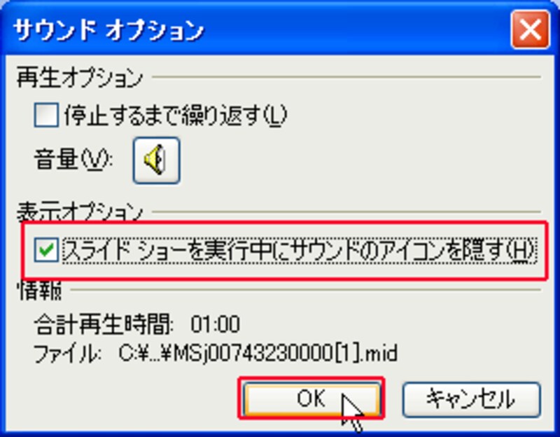 「サウンドオプション」画面が表示されたら、「スライドショー実行中にサウンドのアイコンを隠す」をクリックしてチェックを付け、「OK」ボタンをクリックします。