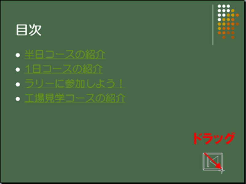今回のスライドでは、ほかの3枚のスライドにも、目次スライドに戻る動作設定ボタンを作成する必要があります。ただし、ひとつひとつ作成したのでは時間がかかる上に、ボタンの大きさも少々違ってしまうかもしれません。「半日コースの紹介」スライドに作成した動作設定ボタンをコピーして使い回せば、素早く仕上げることができて便利です。