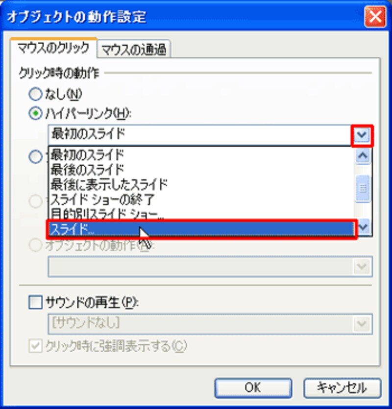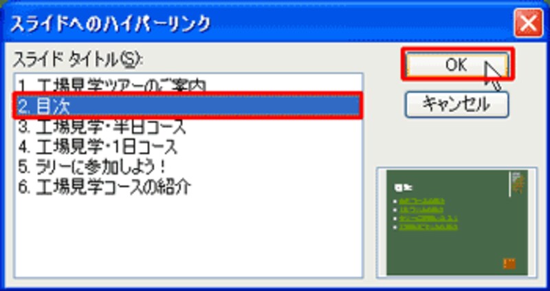 マウスポインタが黒い十字に変わったら、スライドの右下あたりをドラッグしてボタンを描画します。描画すると自動的に「オブジェクトの動作設定」ダイアログボックスが開くので、どのスライドにジャンプするかを指定します。今回は目次のスライドにジャンプしたいので、「ハイパーリンク」の右横の▼ボタンをクリックして表示される一覧から「スライド」をクリックし、続く画面で「目次」スライドを指定して「OK」ボタンをクリックします。