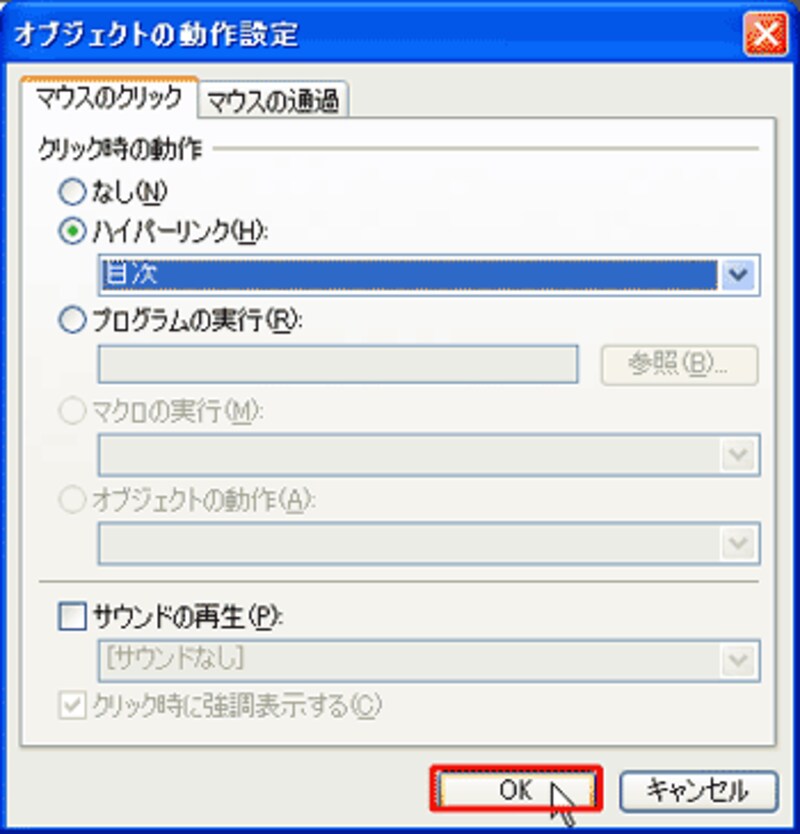「オブジェクトの設定」ダイアログボックスに戻って「OK」ボタンをクリックすると、目次スライドに戻るための動作設定ボタンの完成です。