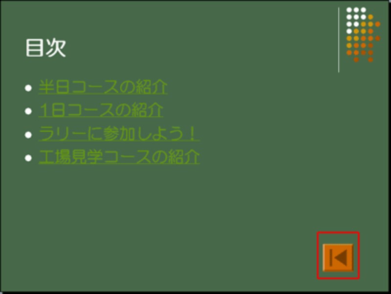 では、「半日コースの紹介」スライドに目次スライドの戻る動作設定ボタンを作ってみましょう。