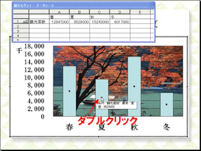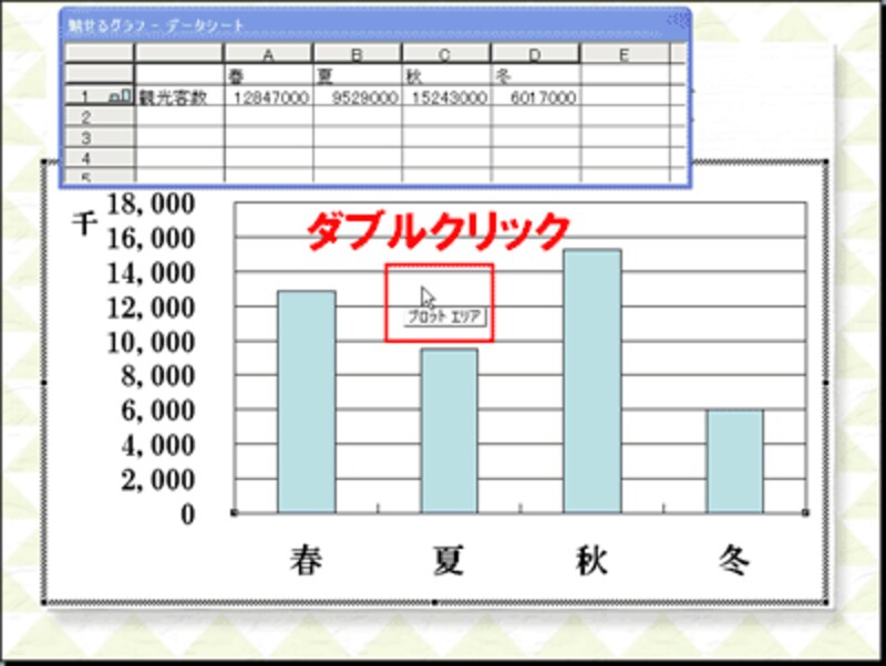 グラフは「タイトル」「凡例」「系列」など、いくつもの部品で構成されており、どの部品に写真を設定するのかを最初に指定します。ここでは、グラフの真後ろに写真を表示したいので、「プロットエリア」と表示される部品をダブルクリックします。