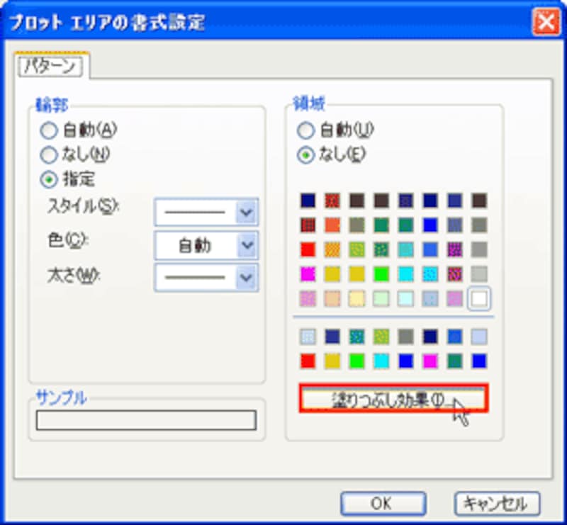 「プロットエリアの書式設定」ダイアログボックスが表示されたら、「塗りつぶし効果」ボタンをクリックします。