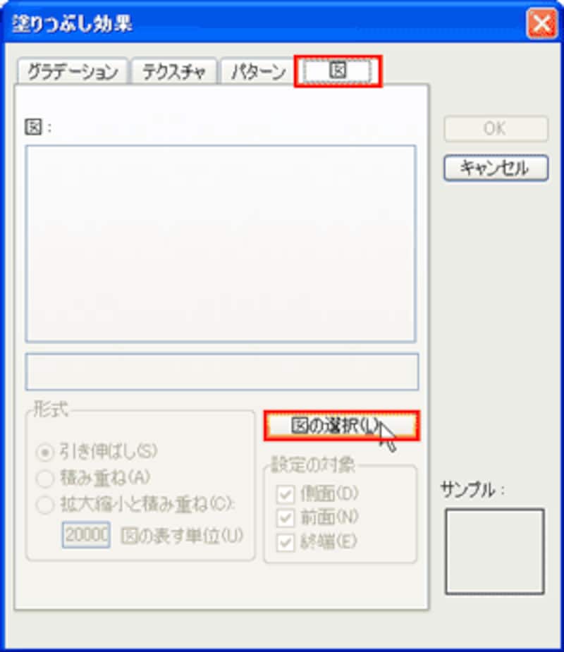 続いて表示される「塗りつぶし効果」ダイアログボックスの「図」タブで、「図の選択」ボタンをクリックします。