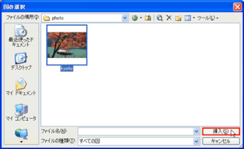 「図の選択」ダイアログボックスで、保存しておいた写真を選択し、「挿入」ボタンをクリックします。