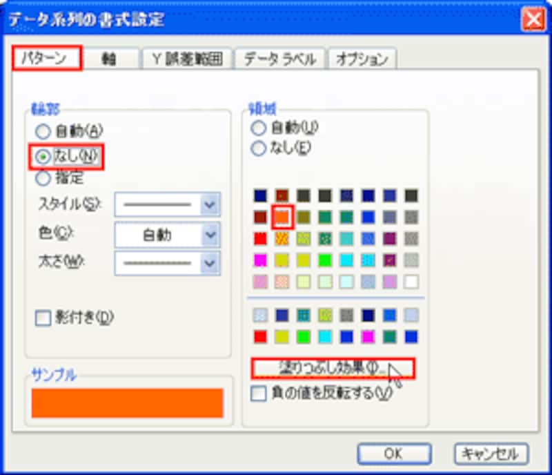 「データ系列の書式設定」ダイアログボックスが表示されたら、「パターン」タブの「輪郭」を「なし」に変更し、「領域」で棒の色を選択します。続けて「塗りつぶし効果」ボタンをクリックします。