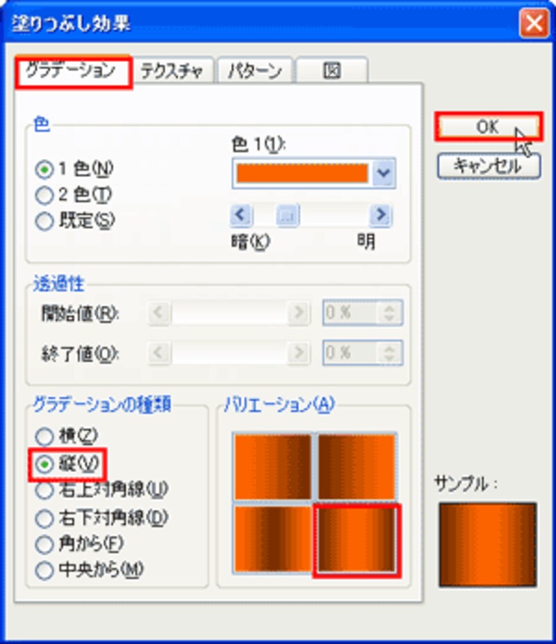 「塗りつぶし効果」ダイアログボックスの「グラデーション」タブで、「グラデーションの種類」を「縦」、「バリエーション」の右下を選択して「OK」ボタンをクリックします。