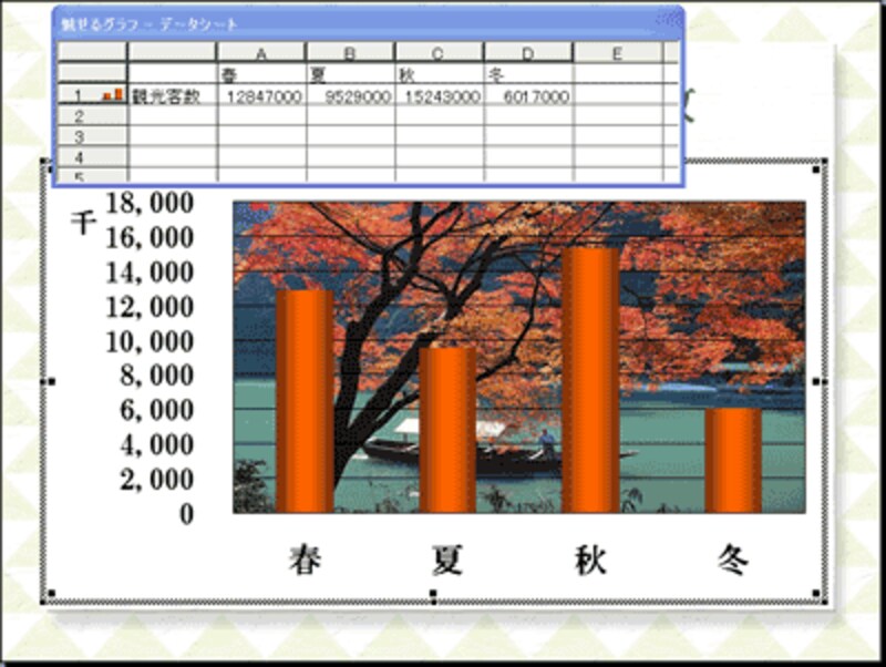 同じグラフでも見せ方次第で、聞き手に与えるインパクトは大きな差があります。そこで「魅せるグラフ」シリーズの第1回目は、グラフの背景に写真を使う方法と、棒グラフの棒に立体感を出す方法を解説します。