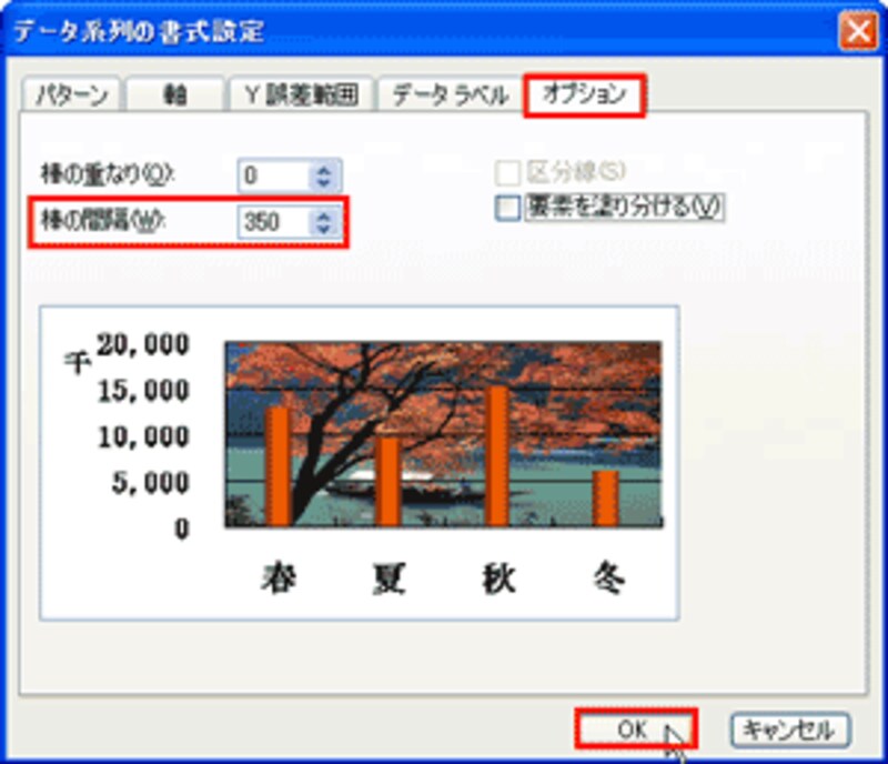 最後に、背景の写真がよく見えるように、棒の太さを若干細く調整します。もう一度、4本の棒のいずれかをダブルクリックして「データ系列の書式設定」ダイアログボックスを開きます。「オプション」タブの「棒の間隔」の数値を大きくすると、棒の太さが細くなります。