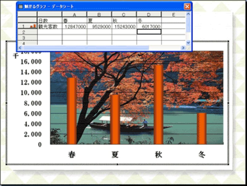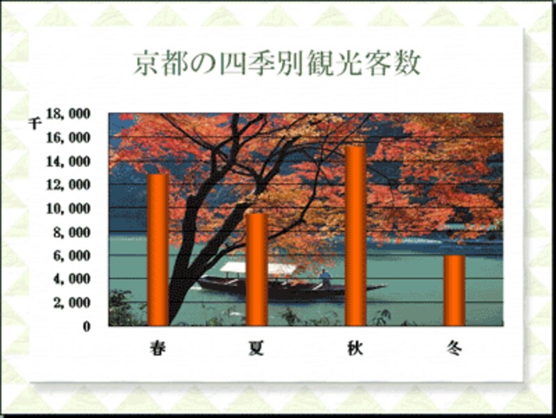 「塗りつぶし効果」ダイアログボックスに戻ったら「OK」ボタンをクリックし、続いて「プロットエリアの書式設定」ダイアログボックスに戻ったらもう一度「OK」ボタンをクリックします。これで、グラフの背景に指定した写真が表示されたことが確認できます。