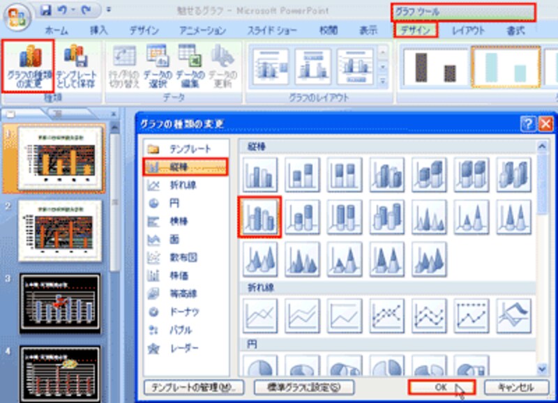 なお、PowerPoint2007では、棒にグラデーションを設定しなくても、グラフの種類を変更するだけで、円柱のグラフを作成できます。