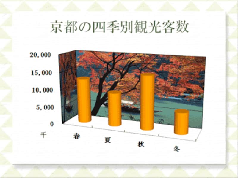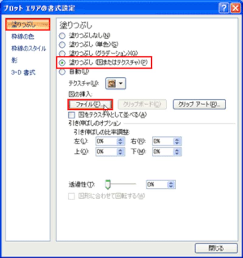 | 背景に写真を敷くときは、「プロットエリアの書式設定」ダイアログボックスの「塗りつぶし」で、「塗りつぶし(図またはテクスチャ)」を選んでから写真のファイルを指定する |