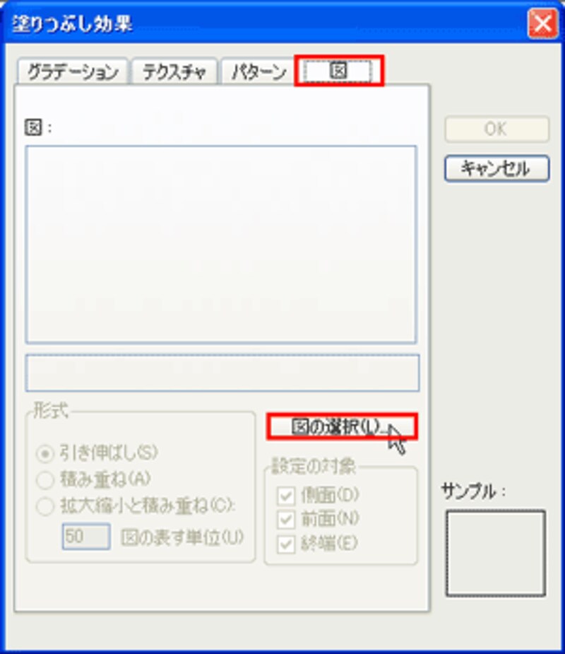 「塗りつぶし効果」ダイアログボックスの「図」タブにある「図の選択」ボタンをクリックします。